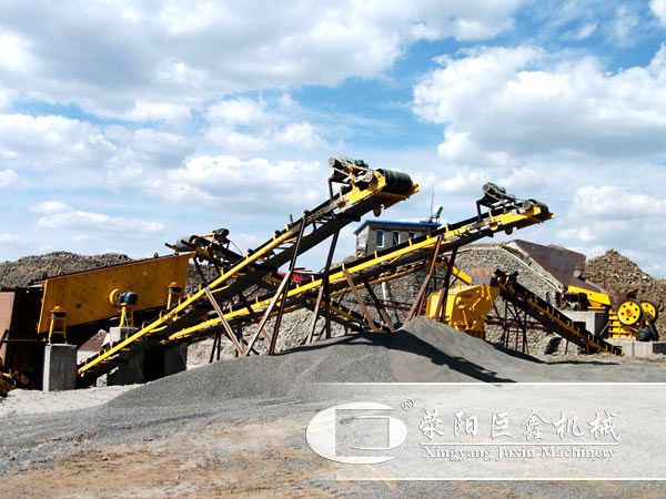 大理石由給料機(jī)均勻地送進(jìn)粗碎機(jī)進(jìn)行初步破碎,然后,產(chǎn)成的粗料由膠帶輸送機(jī)輸送至二 破碎機(jī)(反擊式破碎機(jī))進(jìn)行進(jìn)一步破碎,細(xì)碎后的石料進(jìn)振動篩篩分出不同規(guī)格的石子,滿足粒度要求的石子由成品膠帶輸送機(jī)送往成品料堆;不滿足粒度要求的石子由膠帶輸送機(jī)返料送到反擊式破碎機(jī)進(jìn)行再次破碎,形成閉路多次循環(huán),成品粒度可按照用戶的需求進(jìn)行組合和分級,為保護(hù)環(huán)境,可配備輔助的除塵設(shè)備。